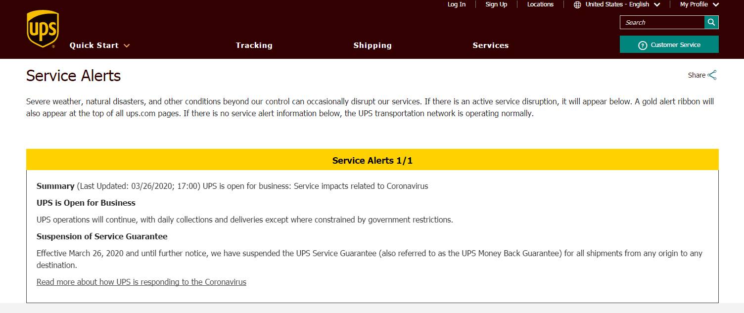 接UPS官方通知,从3.26日起暂停受理所有货件开查(https://www.ups.com/us/en/service-alerts.page?id=alert1)。即货物提取后如果没有进一步更新等情况,只能等待UPS官网的进一步更新,无法开查询问UPS调查货件进度。FedEx、DPD等其他快递公司当前开查也非常缓慢。所以我们建议您提供箱单发票时,务必核对好上面的派送地址和其他申报信息,我们将严格按照贵司提供的地址制单并派送货物,如因地址,邮编,城市,国家等信息提供错误,导致货物被派错,后果自负。谢谢您